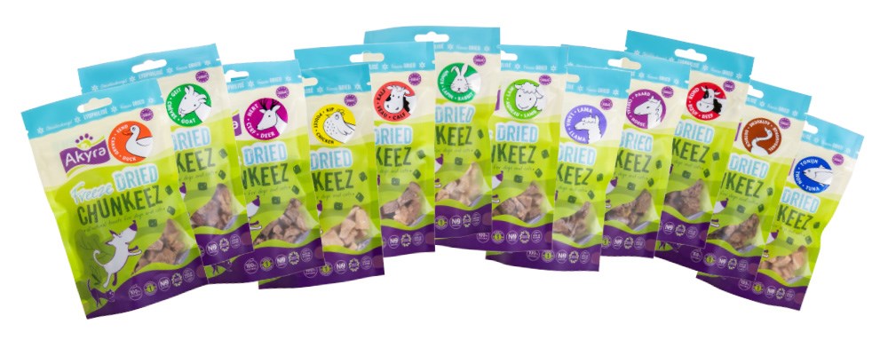 Découvrez la nouvelle gamme lyophilisée d'Akyra ! Naturelle et soigneusement lyophilisée, sans additifs. Pour les vrais carnivores, un régal irrésistible au goût et à l'odeur de viande crue fraîche. Fabriquée en Europe, elle ne contient qu'un seul ingrédient : de la viande issue d'une seule source de protéines. Sans additifs et transformée au minimum.