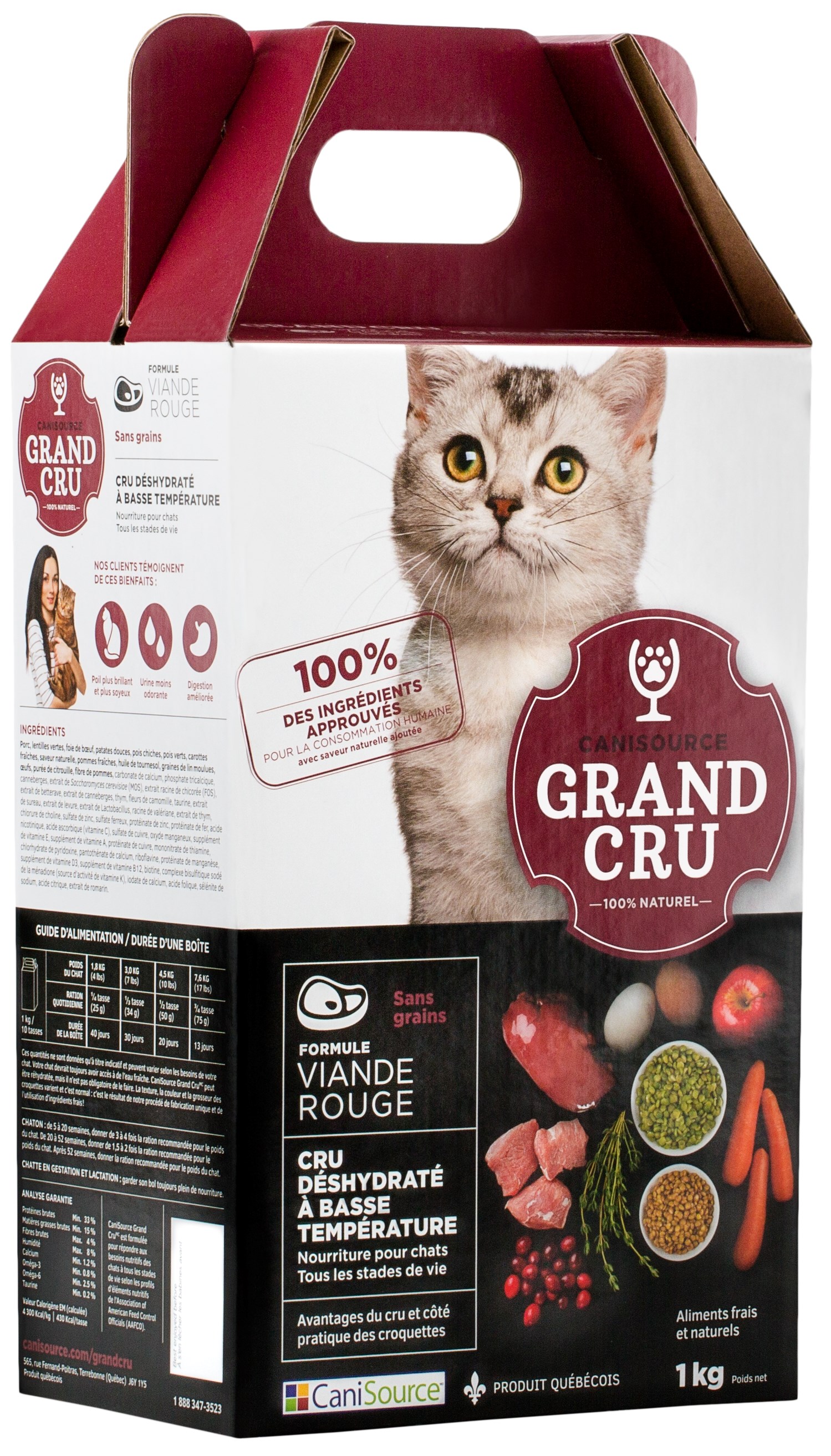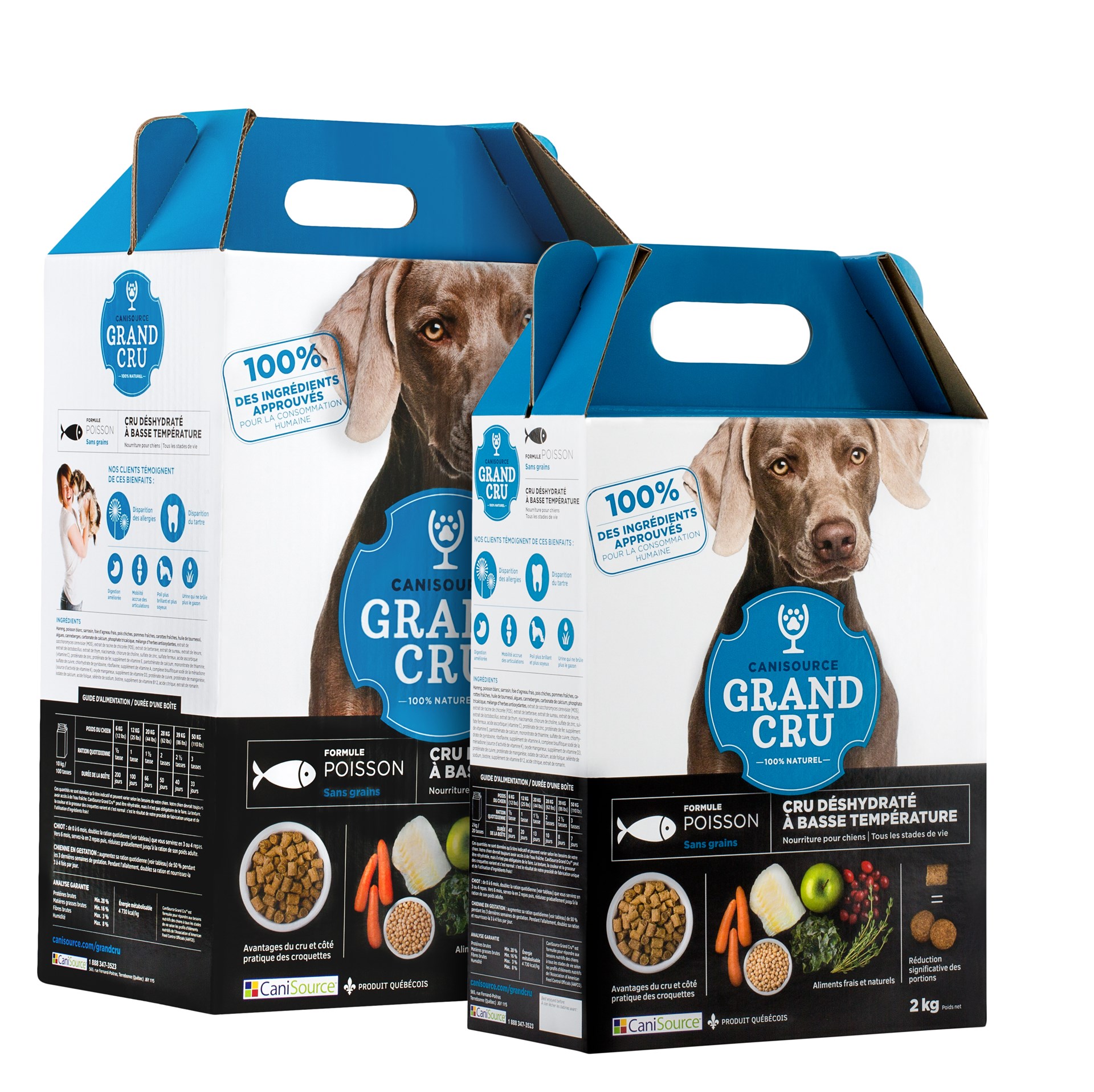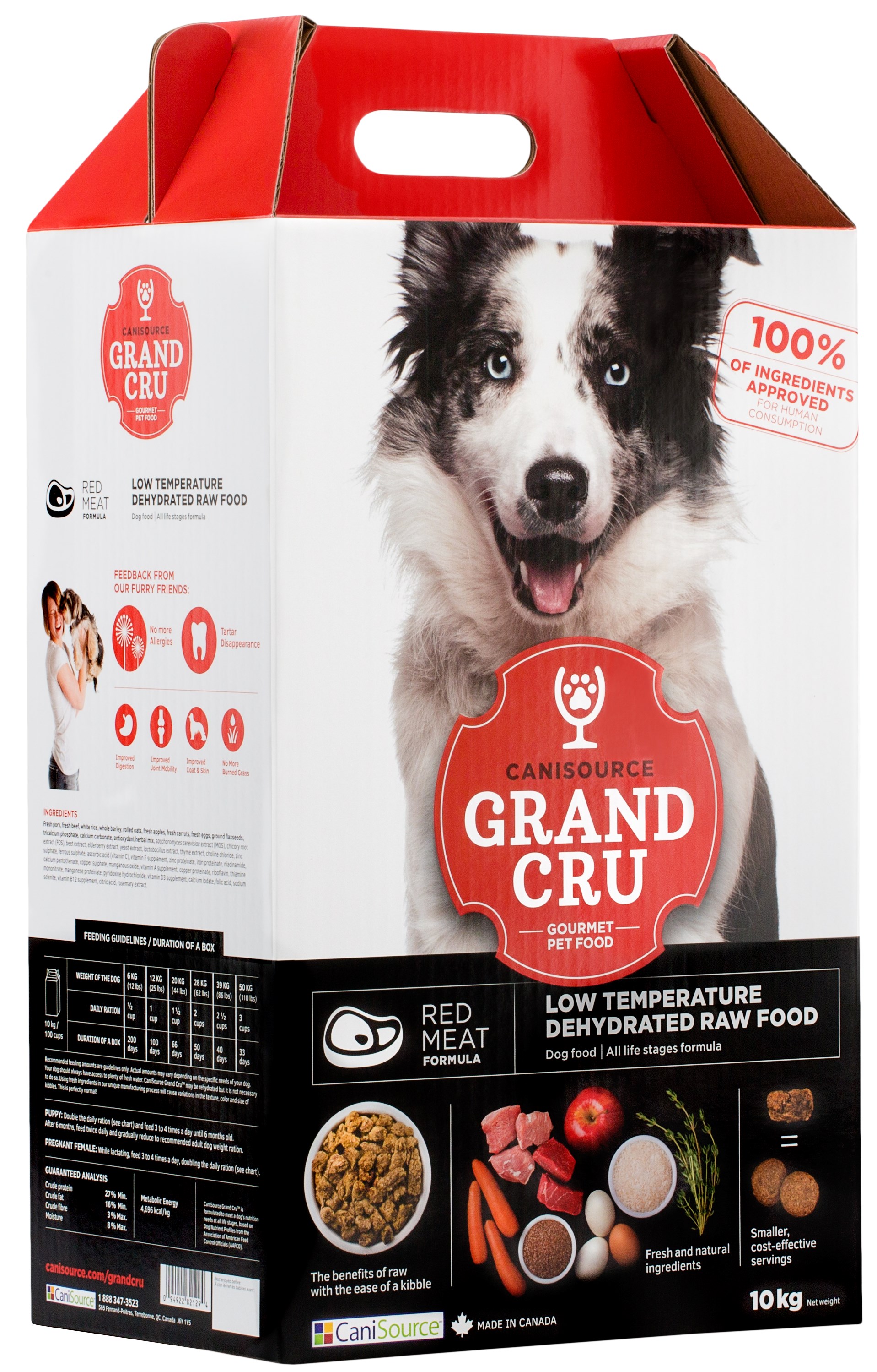 Canisource Grand Cru révolutionne l’alimentation sèche avec son procédé de déshydratation à basse température et l’utilisation d’ingrédients 100% qualité alimentaire humaine. Des croquettes entièrement naturelles qui peuvent être servies telles quelles, ou humidifiées pour se transformer en délicieuse pâtée. Très nutritives, elles nécessitent une ration journalière réduite, ce qui en fait un produit haut de gamme avantageux sur la durée. Grand Cru, c’est le meilleur des deux mondes : tous les bienfaits et les avantages d’une alimentation crue avec le côté pratique et économique d’une alimentation sèche.
