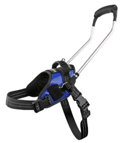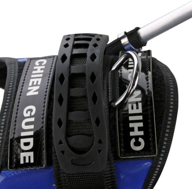 Harnais pour chien-guide d’aveugle, conçu en collaboration avec l’École de Chiens Guides de l’Est (France) afin de répondre aux exigences fonctionnelles et ergonomiques du travail de guidage.