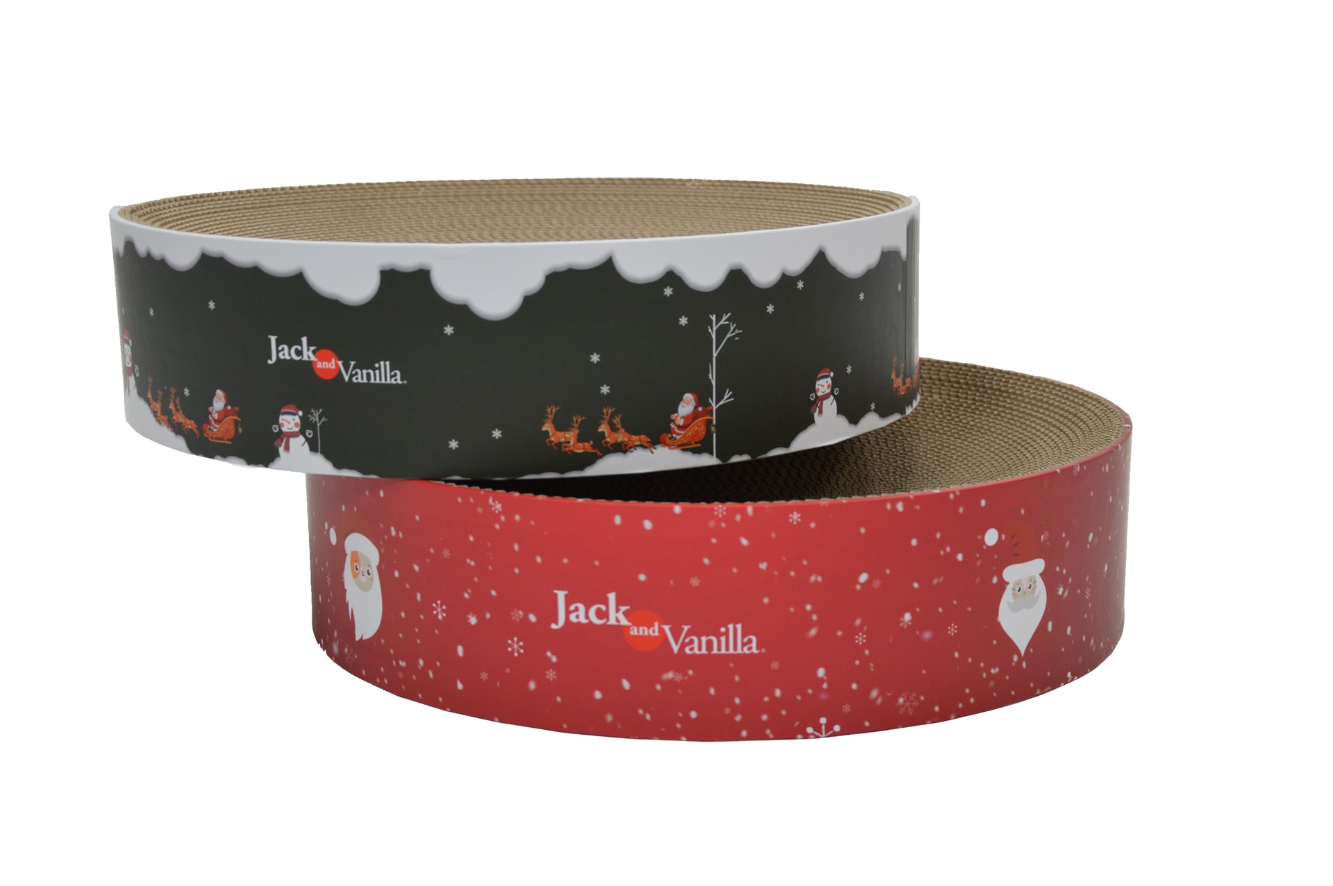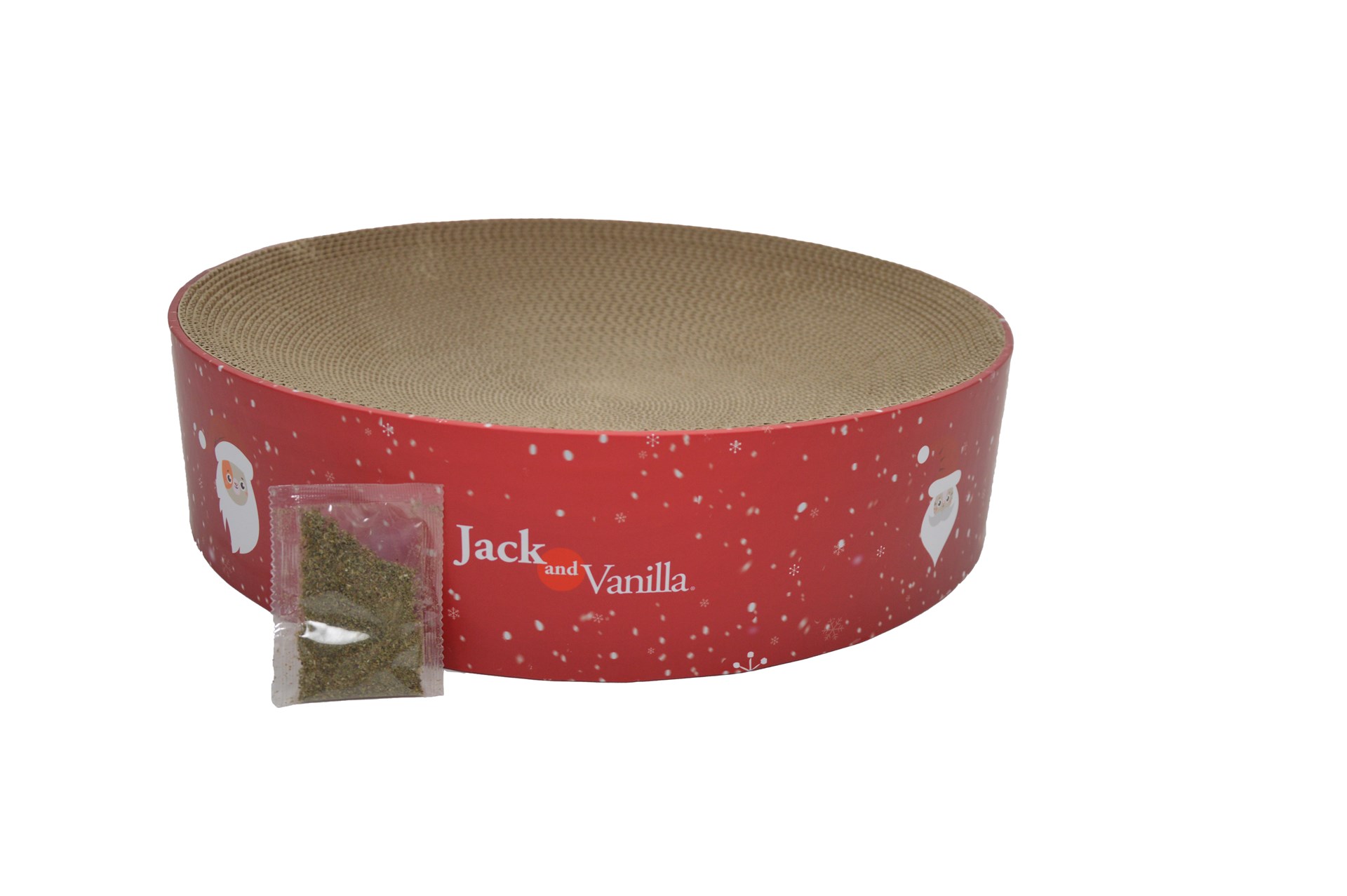 Griffoir rond et robuste en carton avec de joyeuses illustrations de Noël. Idéal pour griffer, se coucher et se détendre. Livré avec de l’herbe à chat pour attirer encore plus votre chat.