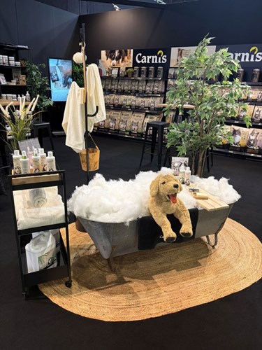 Hier ontdekten we deze leuke opstelling waarmee deze Nederlandse firma haar assortiment verzorgingsproducten voor honden, gaande van shampoos, conditioners en bodymist onder de aandacht bracht. De verschillende referenties bestaan voor minstens 93% - in sommige gevallen zelfs tot 98% - uit natuurlijke ingrediënten.