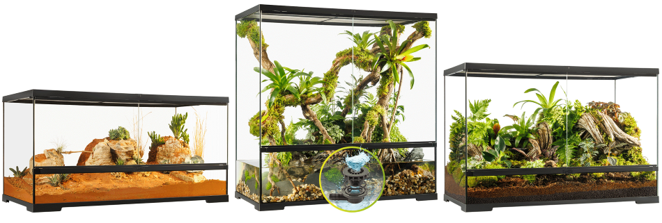 De Pro Terrariums en Pro Paludariums van Exo Terra vertegenwoordigen het toppunt van habitatontwerp, waarbij geavanceerde functionaliteit wordt gecombineerd met verfijnde esthetiek. Dankzij het gepatenteerde, verstelbare ventilatiesysteem wordt condensatie voorkomen en is een optimale luchtcirculatie gegarandeerd voor een gezondere leefomgeving. Het afneembare, afsluitbare deksel is voorzien van hoogwaardig roestvrijstalen gaas voor een superieure UVB-doorgang. Veilige vergrendelingsmechanismen en de vergrote leefruimte ondersteunen diverse microhabitats. Doordachte details, zoals efficiënt kabelbeheer en een verhoogd bodemframe, maken de Pro Terrariums en Pro Paludariums de ultieme keuze voor de moderne herpetocultuur.