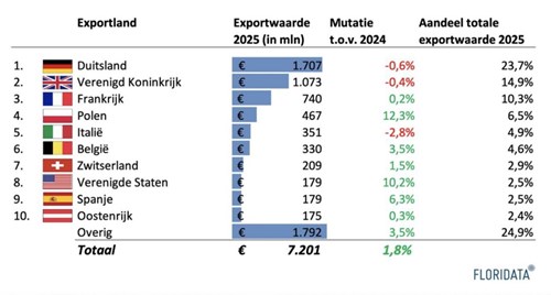 De exportcijfers per land laten een wisselend beeld zien. De handel met Duitsland en het Verenigd Koninkrijk liep licht terug, terwijl Frankrijk een kleine groei noteerde. Polen sprong eruit met een toename van 12,3% en ook de Verenigde Staten lieten een sterke stijging zien van 10,2%.