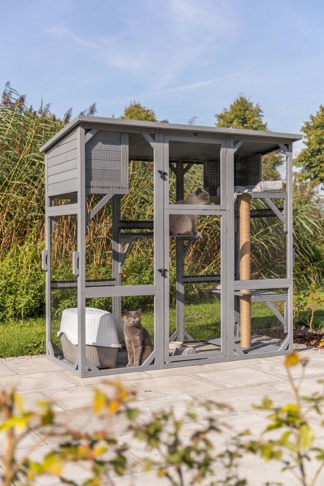 Met de nieuwe kattenren van TRIXIE biedt u uw klanten de perfecte oplossing voor een gecontroleerde buitenruimte. Het stevige houten frame met poedergecoat gaas zorgt voor stabiliteit, terwijl het weerbestendige dak met asfaltpapier betrouwbare bescherming biedt. Een geïntegreerde schuilplaats met opklapbare voorkant, twee plateaus (waarvan één neerklapbaar), een windbeschut ligplekje en een jute krabstam bieden katten volop afwisseling. Hierdoor is deze kattenren ideaal voor zowel actieve als rustige viervoeters. Dankzij de gedeelde toegangsdeur, de zijden draaggrepen voor eenvoudig verplaatsen en de praktische TRIXIE 'Easy'-sluiting is de ren zeer gebruiksvriendelijk en snel te openen en te sluiten. De afmetingen van de ren bedragen 181 × 169 × 88 cm. Neem deze outdoor noviteit nu op in uw assortiment, want het is een echte blikvanger voor elke klant! Klik hier voor meer info.