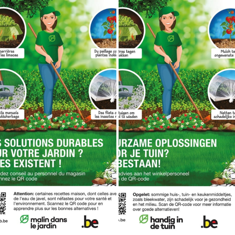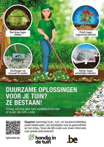 Vanaf 1 maart 2026 moeten alle Belgische tuincentra en doe-het-zelfzaken hun klanten nog duidelijker informeren over het correct en veilig omgaan met gewasbeschermingsmiddelen in de tuin en over duurzame alternatieven. Elk verkooppunt dat gewasbeschermingsmiddelen voor niet-professioneel gebruik aanbiedt, moet de twee officiële affiches (zie foto's) zichtbaar ophangen in de winkelrekken. Zo krijgen consumenten duidelijke en betrouwbare informatie op het moment dat ze een aankoop overwegen. De QR-code op de posters leidt naar een pagina, waar tuinliefhebbers aanbevelingen kunnen vinden voor veilige en duurzame keuzes in de tuin.